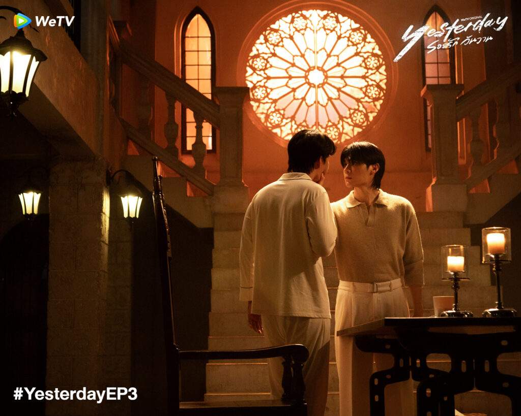 Aired on February 16, Yesterday episode 3 shows Vier and Kelvin officially becoming business partners and celebrating the grand opening of their hotel, V&V Group. When Kelvin admits he doesn’t want their relationship to be just a one-night stand, Vier proves he is serious, and the two soon become boyfriends. However, in the present timeline, Vier confronts Kelvin, saying he’s a liar.