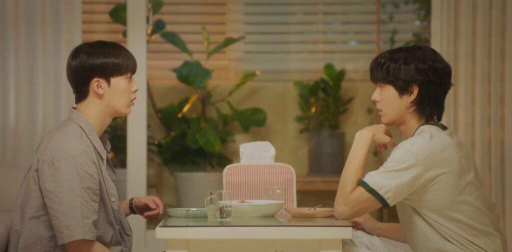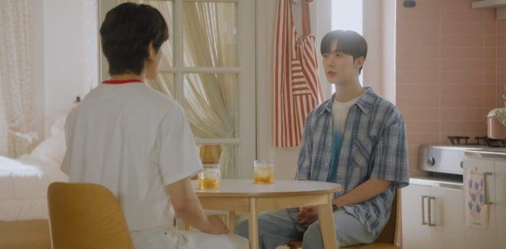 Min Hyeok, craving another round of drinks, begs Yoon Jae to make hwachae. Yoon Jae agrees—but only on one condition: Min Hyeok has to let him try kissing him. Yoon Jae explains that if he can kiss a man, maybe he can do the same with Ji Eun in her male form. He leans in to try… but pulls back at the last second. “I really can’t kiss a man,” he admits, frustrated.