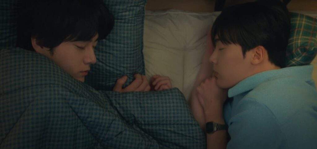 Min Hyuk calls Yoon Jae over. The moment Yoon Jae sees him half-naked, he panics and storms inside, thinking something happened—only to find Ji Hoon fast asleep. Yoon Jae crashes next to him on the floor. Later, Min Hyuk reveals that while drunk, Ji Hoon kept calling Yoon Jae’s name—apologizing, thanking him, and saying he loves him.