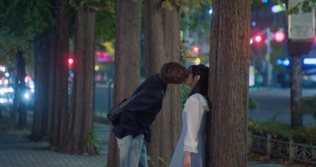 After the book signing, Yu Ri drinks again, regretting her first kiss. But when Min Hyuk joins her, he kisses her on the lips to ease her regret—turning it into her “second first kiss” on their way home.