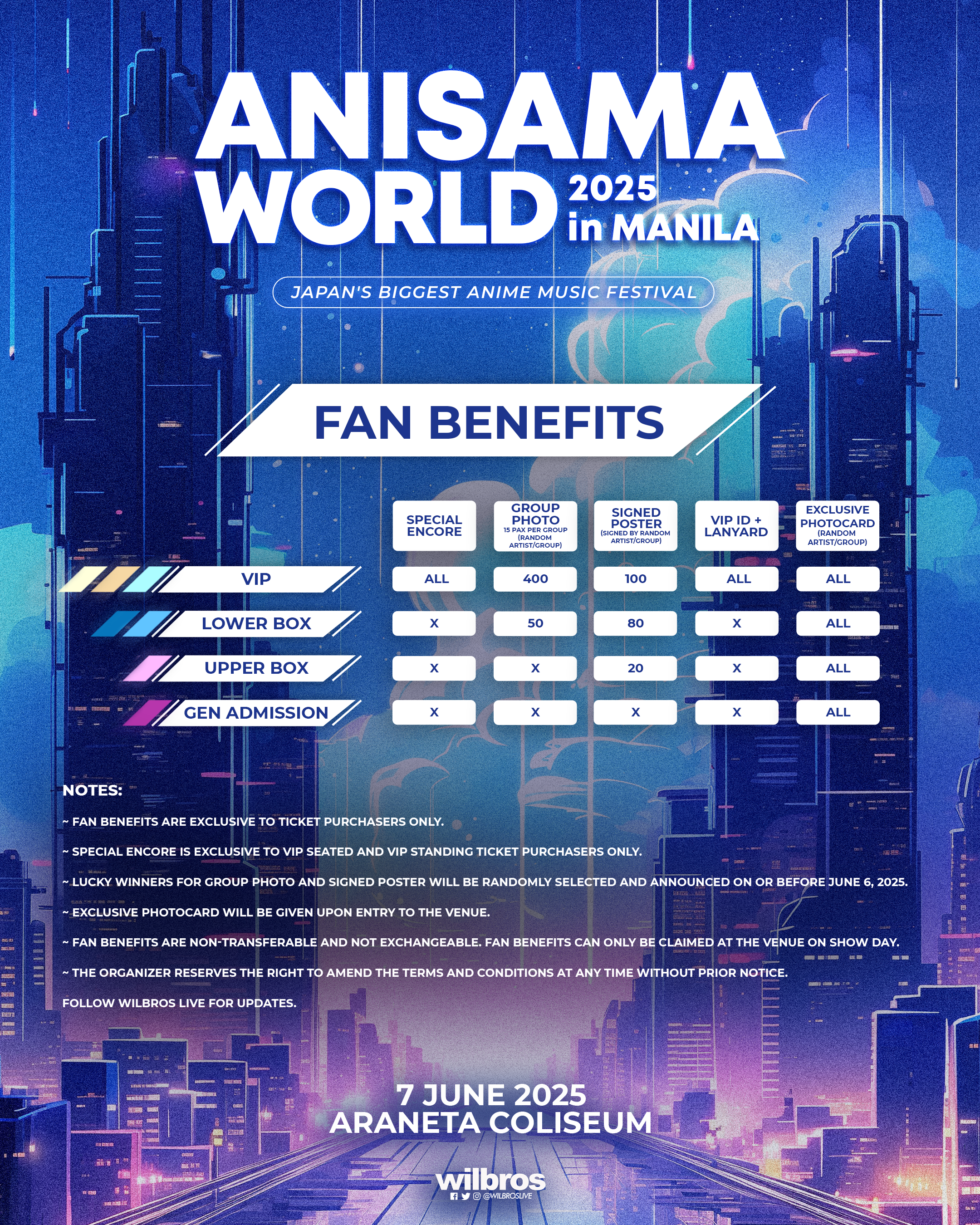 VIP ticket holders get a special encore and a VIP ID & lanyard. And an entry into a raffle for 400 winners for a group photo op and 100 winners for signed posters. Lower Box holders have 50 winners to win a group photo (15 per group/artist) and 80 chances to win a signed poster. The raffle also includes 20 winners for signed posters in the Upper Box holders’ category. All attendees will receive an exclusive photocard.