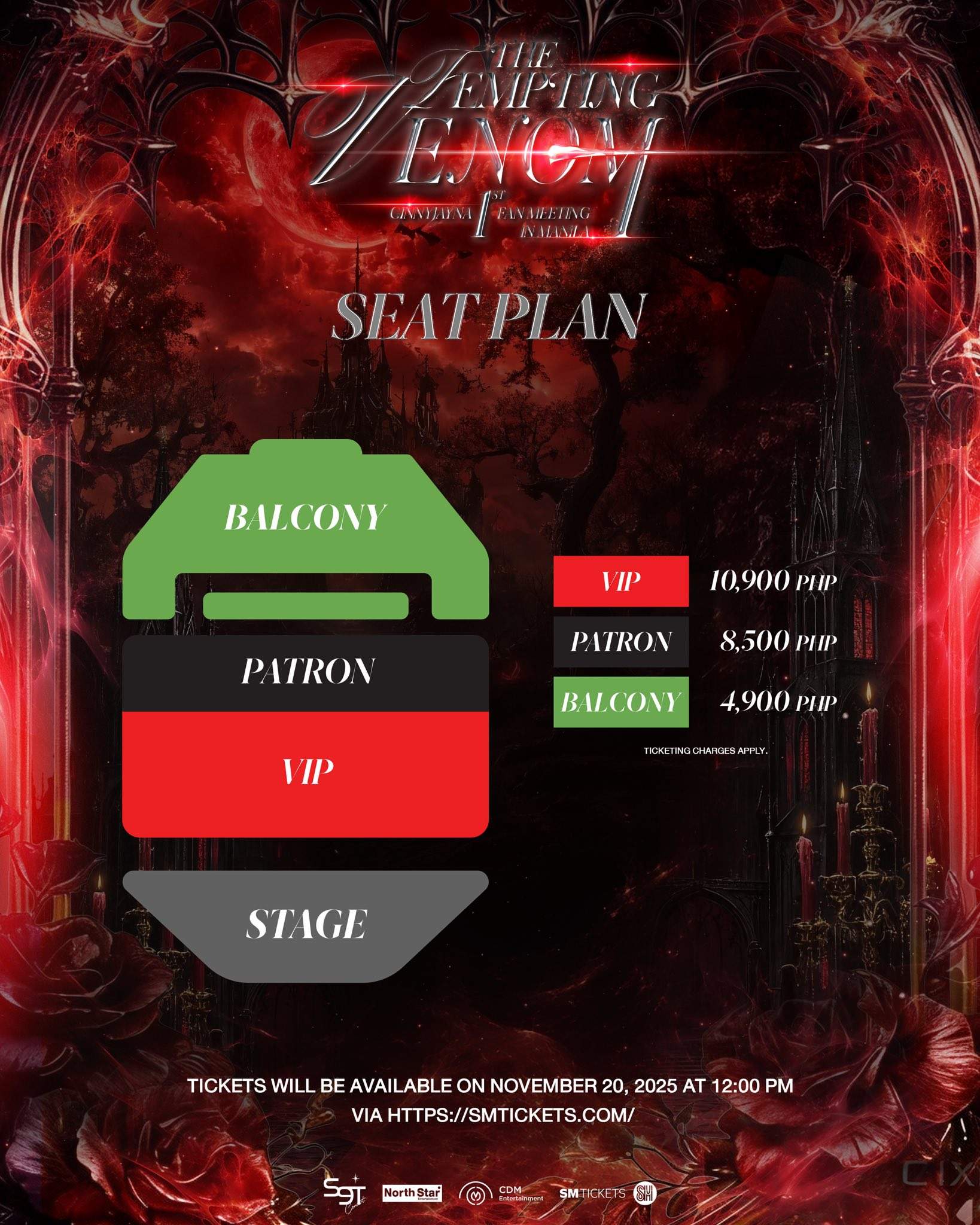 The event has 3 seating tiers: VIP for PHP 10,900, Patron for PHP 8,500, and Balcony for PHP 4,900. Tickets will go on sale on November 20, 2025 at 12:00 PM (GMT+8). Tickets will be available at smtickets.com.