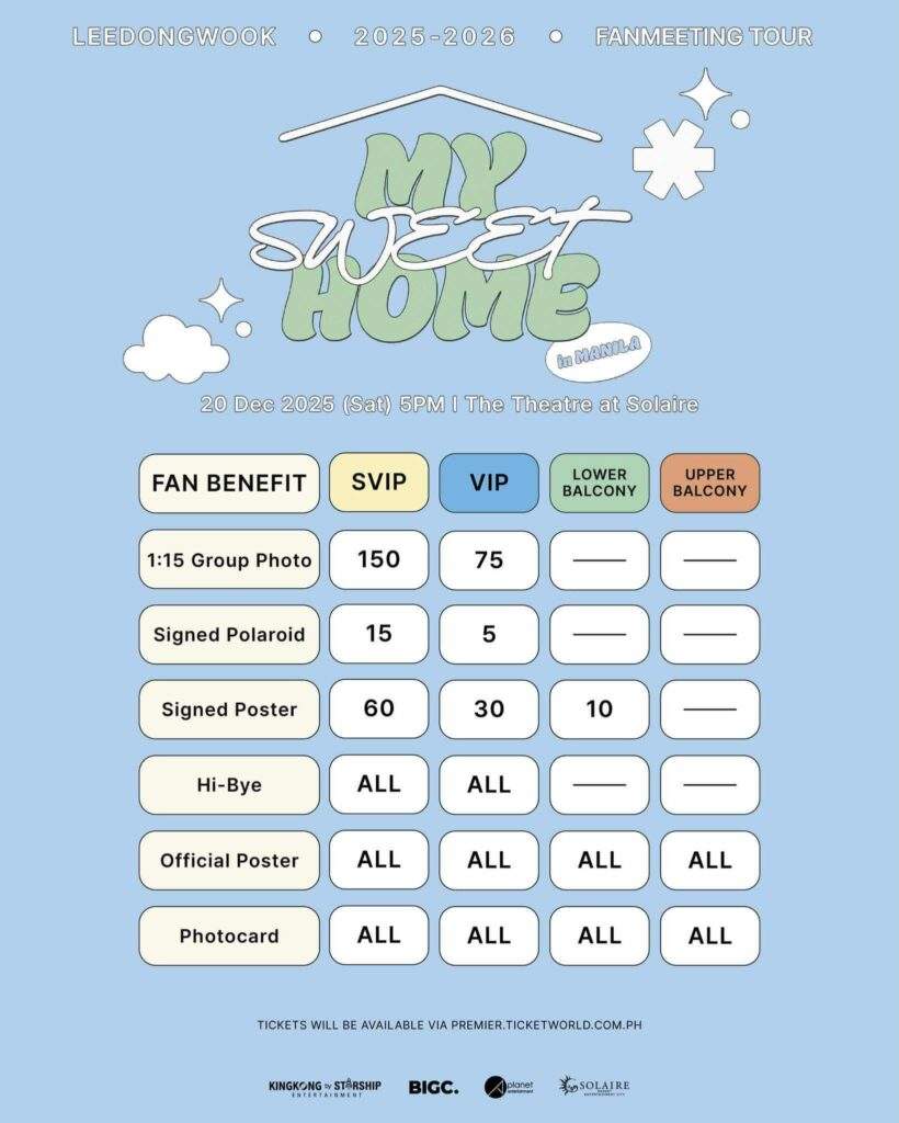 For fans eager to meet Lee Dong-wook in person, tickets for the fan meeting are now on sale via Ticketworld and its outlets. You can choose from four seated tiers, ranging from PHP 4,500 to PHP 12,000. Here are the prices for each tier: